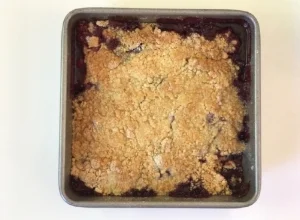 Well, I had plums galore and needed to find something to do with them. I googled a bit and found this very easy recipe for Plum Crisp. Throw some things in a pan and bake.