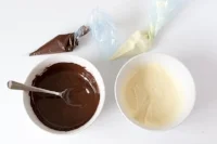 You will need chocolate icing and white icing. You will need a way to make thin piping. We did chocolate icing with white circles, but you can do the reverse or you can do a mix of both.