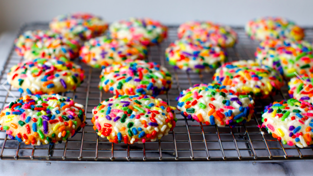 Transfer balls of sprinkle-coated dough to baking sheets at least two inches apart. Use the bottom of a drinking glass to press down on the cookies until they are about 1/4 to 1/2-inch tall. If you see any bare spots in the sprinkles that bother you, you can sprinkle a few more on top. Bake for 9 to 10 minutes until they look underbaked but lightly golden underneath. [If they’re not quite soft in the center, they will be fully crisped through the next day.] Let set on the baking sheet on a rack for a few minutes before transferring to cooling racks to cool the rest of the way. Repeat with remaining cookie dough.