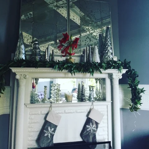 Listening to Christmas Carols while getting the ornaments out of the box is one of my favorite moments of the year.  Lately I lean toward a more understated look rather than over the top red and green.  Above is a photo of my mantle showing green mixed with silver, grey, & white.