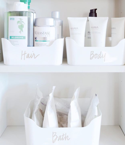 Notice some themes. Put things in containers/buckets. Add a label with a pretty pen and nice handwriting. Group like items together based on category. This feels so much calmer and helps people find what they need. Nothing too crowded.