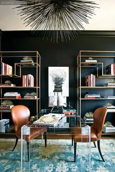 Going the opposite route of white....we have the dark moody office. I love the mix above of the glam textured light fixture, warmth of tan leather chairs, modern acrylic table, and traditional rug.